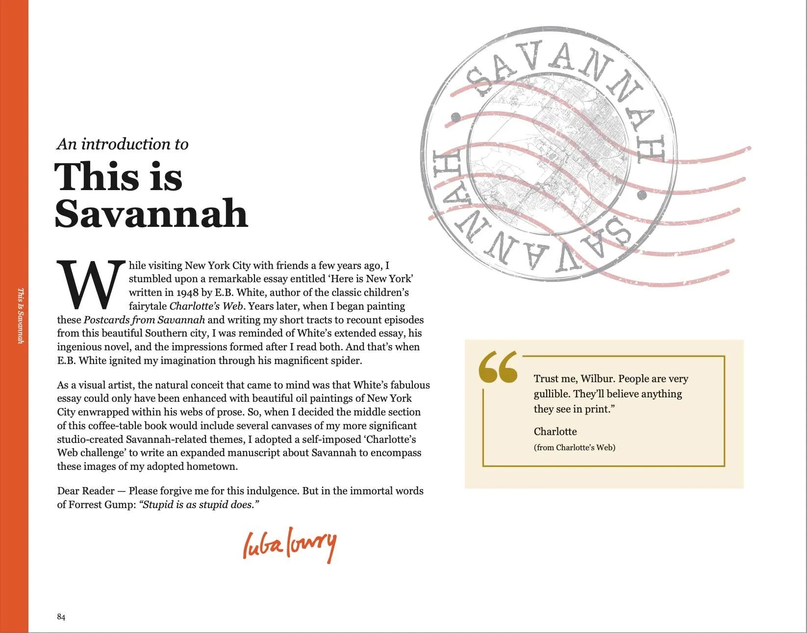 A heartfelt and visually captivating love letter to the most extraordinary city in the American South. This 14½ x 11¼ delightfully designed, 208-page hard-cover coffee-table book features over 200 beautiful oil paintings of Savannah, including 160 postcard-sized en plein air works, each with a distinctive and engaging narrative. It includes a thoughtfully written extended essay accompanying three dozen of Luba’s larger, magical works, delving into Savannah’s rich yet complex 300-year story, exploring its multi-layered, often dark past with depth and nuance. More than an art book, Postcards from Savannah—the art of Luba Lowry is an immersive journey through this port city’s cobblestone streets, ghostly Spanish Moss-draped great oaks, storied landmarks, infamous graveyards, gorgeous Squares, and essential river. It invites art lovers and readers alike to experience Savannah’s distinctive soul—its elegance, contradictions, and enduring magic—through the eyes of one of the city's most passionate artistic chroniclers.