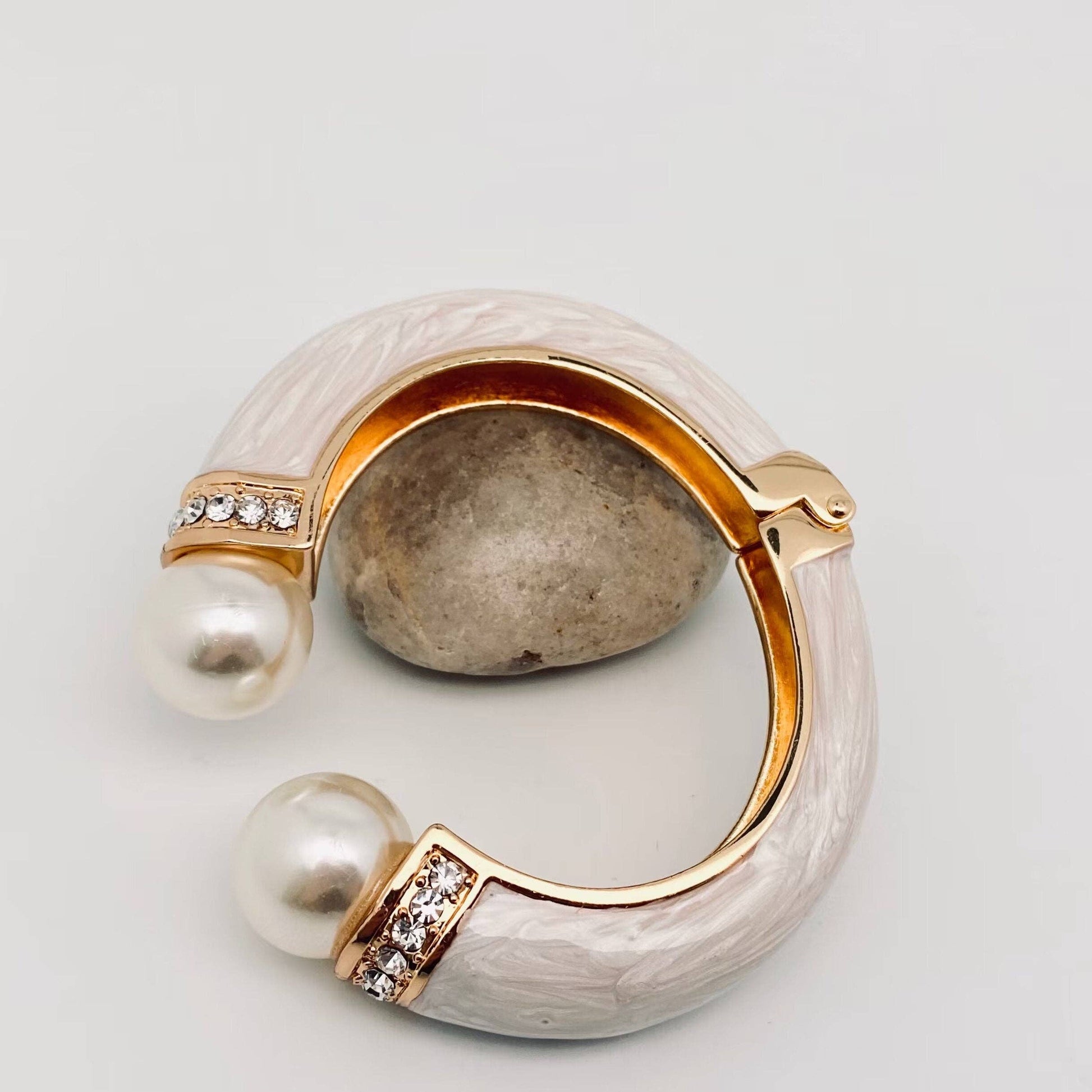 Slip into timeless elegance with this vintage-inspired pearl and enamel bangle! Featuring a half-opening design with an inner diameter of 2.25 inches and a comfortable 10.5mm width, this stunner combines lustrous imitation pearls with sparkling rhinestone accents in classic white and gold tones. Made from quality zinc alloy and completely nickel-free and lead-free, it's gentle on all skin types. A versatile treasure that transitions seamlessly from casual to formal—the perfect gift for anyone who loves a touch of vintage glamour.